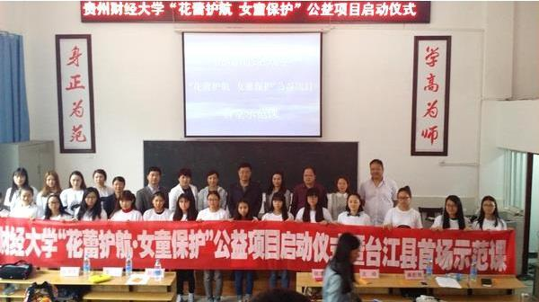 贵州财经大学“花蕾护航·女童保护”团队成立以来,充分发挥教育扶贫的造血功能,持续开展“爱心共筑彩虹桥”公益活动,组织青年师生深入57个县(区)乡镇开展防性侵等讲座 566场,5万余名儿童受益,培养当地乡村讲师600余名,完成留守儿童安全教育调查问卷4654份,实现了留守儿童关爱与高校人才培养互促共赢。“花蕾护航·女童保护”团队2018年荣获“全省优秀志愿服务集体”称号,2019 年,获贵州省志愿服务项目大赛金奖、最具人气奖。