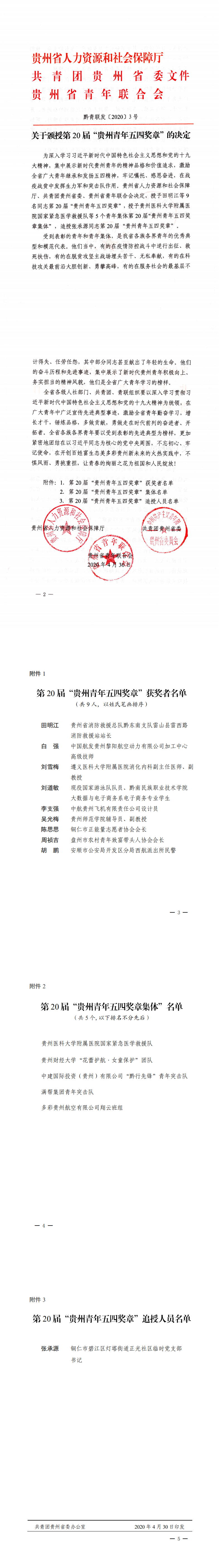 在五四青年节来临之际,贵州省人力资源和社会保障厅、共青团贵州省委、贵州省青年联合会决定,授予田明江等9名同志第20届“贵州青年五四奖章”,授予贵州医科大学附属医院国家紧急医学救援队等5个青年集体第20届“贵州青年五四奖章集体”,追授张承源同志第20届“贵州青年五四奖章”。