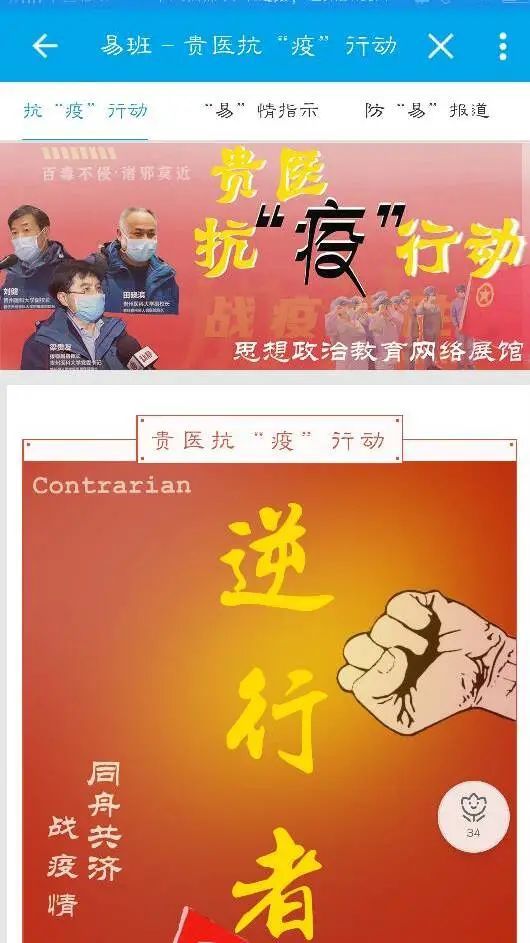 根据《省委教育工委,省教育厅关于在新冠肺炎疫情防控期间加强高校思想政治教育的指导意见》文件精神,贵州医科大学易班发展中心依托易班“云平台”,汇集疫情防疫相关内容,打造出“贵医抗‘疫’行动”特色快搭,将疫情防控作为网络思政教育的生动素材,建成思想政治教育网络展馆。