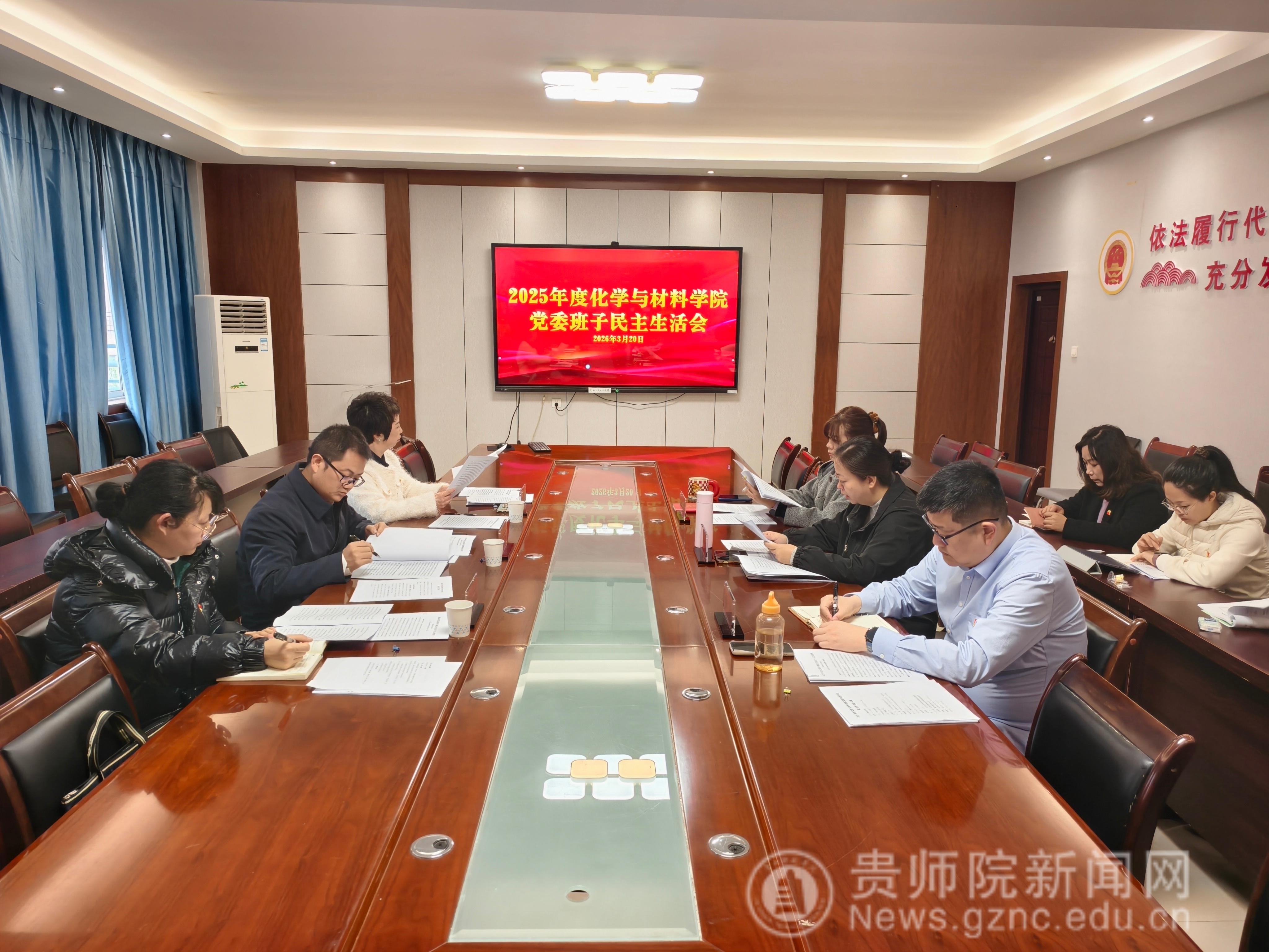 本网讯 按照学校关于开好2025年度校院两级党员领导干部民主生活会工作要求,3月20日,化学与材料学院党委班子在宁静楼525会议室召开2025年度民主生活会。会议深入学习贯彻习近平新时代中国特色社会主义思想,全面贯彻落实党的二十届四中全会精神,以打攻坚战、持久战的决心和恒心,锲而不舍落实中央八项规定精神,推进作风建设常态化长效化,以优良作风凝心聚力、真抓实干,奋力开创中国式现代化建设新局面。