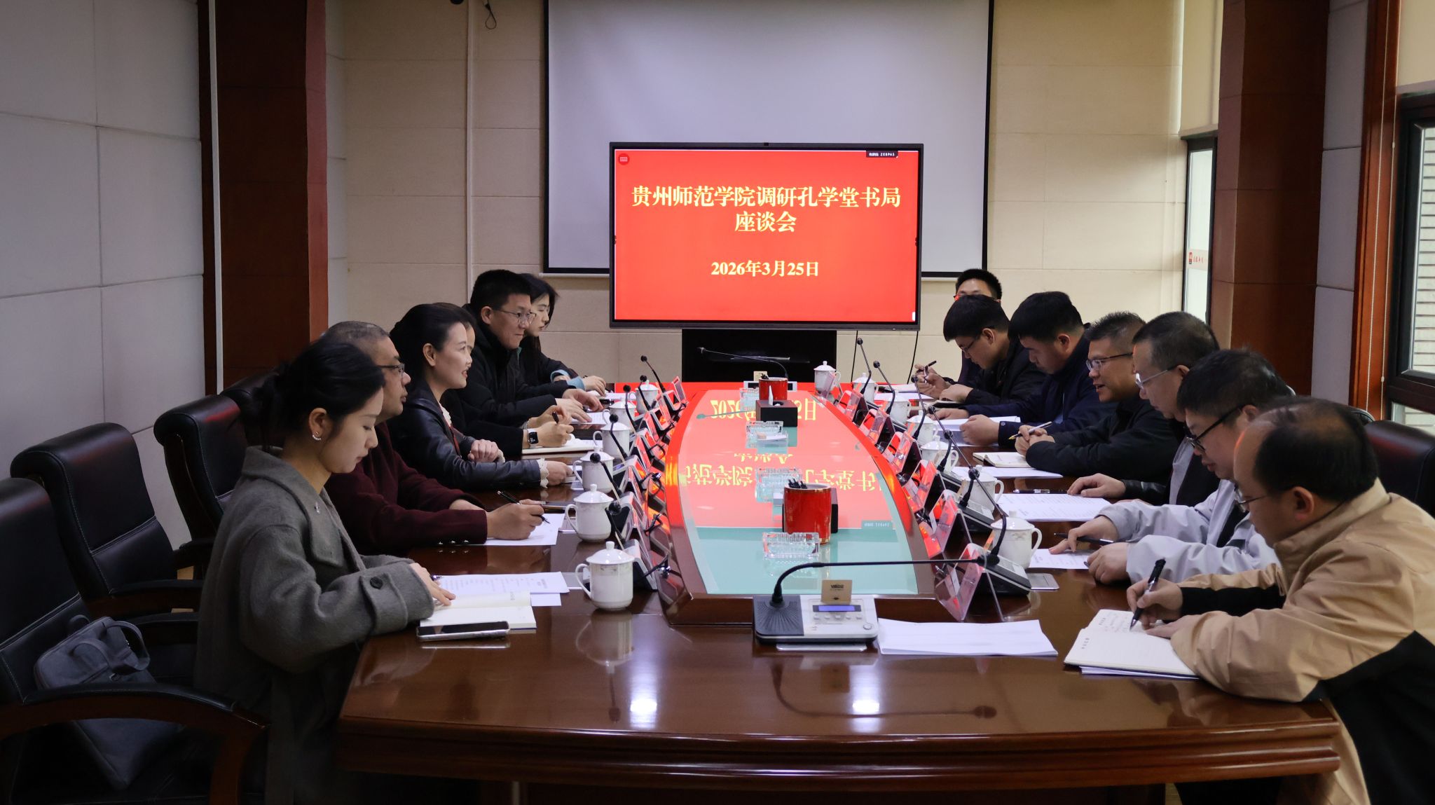 本网讯 为深入贯彻落实党中央、国务院和省委、省政府关于高校毕业生就业工作的决策部署,抢抓春季招聘关键期,3月25日,贵州师范学院党委副书记邹晓青带队,校党委常委、宣传部部长宋婷禹,历史与档案学院院长万国崔、副院长蔡知远,校党政办政策研究室副主任段祝青、历史与档案学院团委副书记王秋实一行,赴贵州日报当代融媒体集团孔学堂书局开展“访企拓岗促就业”专项调研座谈。贵州日报当代融媒体集团党委副书记、副董事长、总经理孟麟,融媒体集团党委副书记、董事、工会主席常勇,孔学堂书局(《孔学堂(中英文)》杂志)常务副总编辑张发贤、副总经理祁定江、副总编辑陈真及相关部室负责人热情接待并参与座谈。会议由融媒体集团党委副书记、董事、工会主席常勇主持。