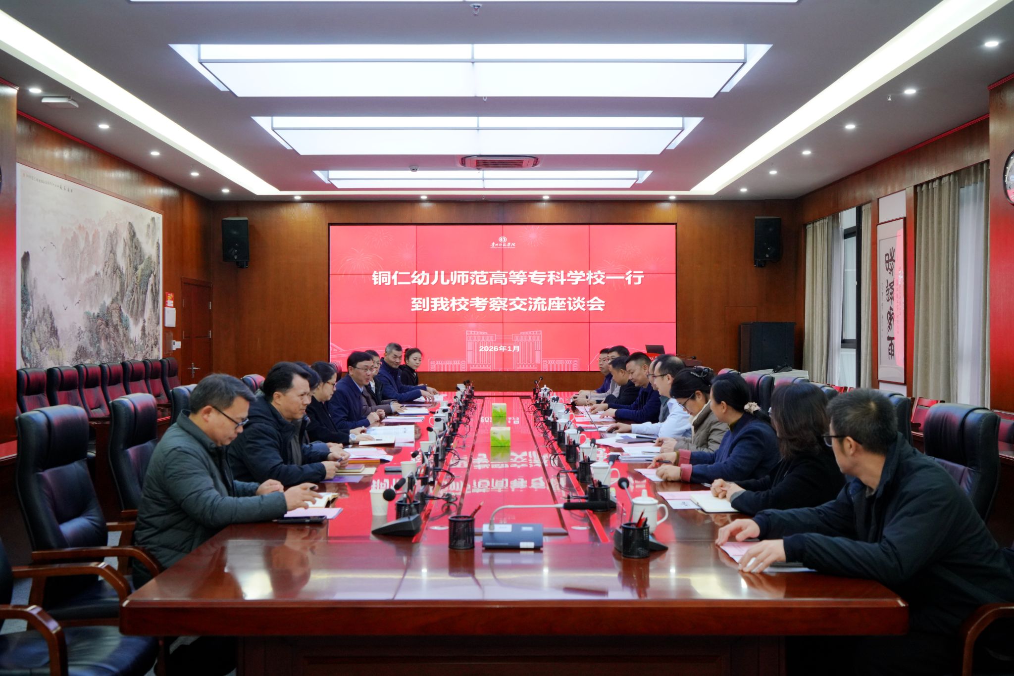 本网讯 1月16日,铜仁幼儿师范高等专科学校党委书记宋选文,党委委员、副校长杨廷树率招生就业处、联合办学教育教学部及相关院系负责人一行到我校考察交流。座谈会在信息楼会议室举行,我校党委书记战勇出席,党委常委、副校长潘运主持会议,党委常委、副校长陈真波陪同考察。