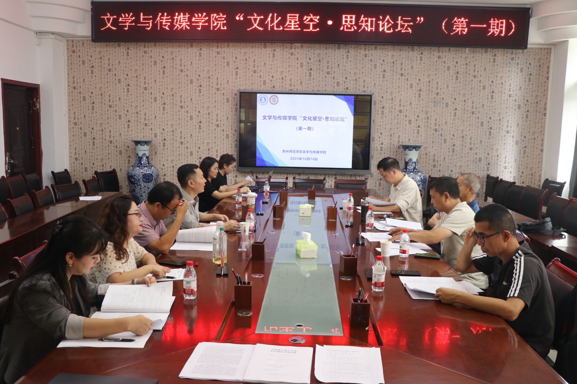 为营造良好的学术氛围,推进学科建设发展,文学与传媒学院于10月14日下午在文韬苑·明理楼313会议室成功举办了“文化星空·思知论坛”(第一期)活动。本次论坛由文学与传媒学院院长、教授杨波主持,特邀贵州民族大学教授、博士生导师杜国景,贵州师范大学教授、博士生导师袁洪权,贵州大学副教授、硕士生导师张波,以及知名作家、《南风》杂志主编冉正万担任点评专家。