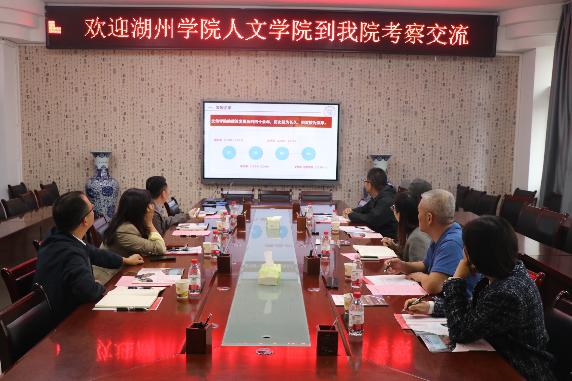 10月20日下午,湖州学院人文学院副院长张文、文学系副主任杨松明、外语系主任李梓、汉语言文学专业负责人颜军、学工办副主任葛一行到我院调研交流。我院党委书记陈亦桥、院长杨波及相关负责人参加此次调研座谈会。