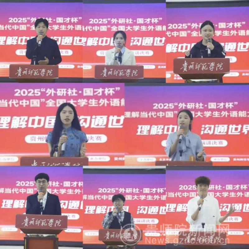 本网讯 10月16日晚,由我院承办的2025年“外研社·国才杯”“理解当代中国”全国大学生外语能力大赛贵州师范学院演讲与口译校赛决赛在我校大学生防艾基地成功举行。王薇、郭娟、张录文、黄菲、赵先凤和美籍专家Andrew Roberts担任评审专家。