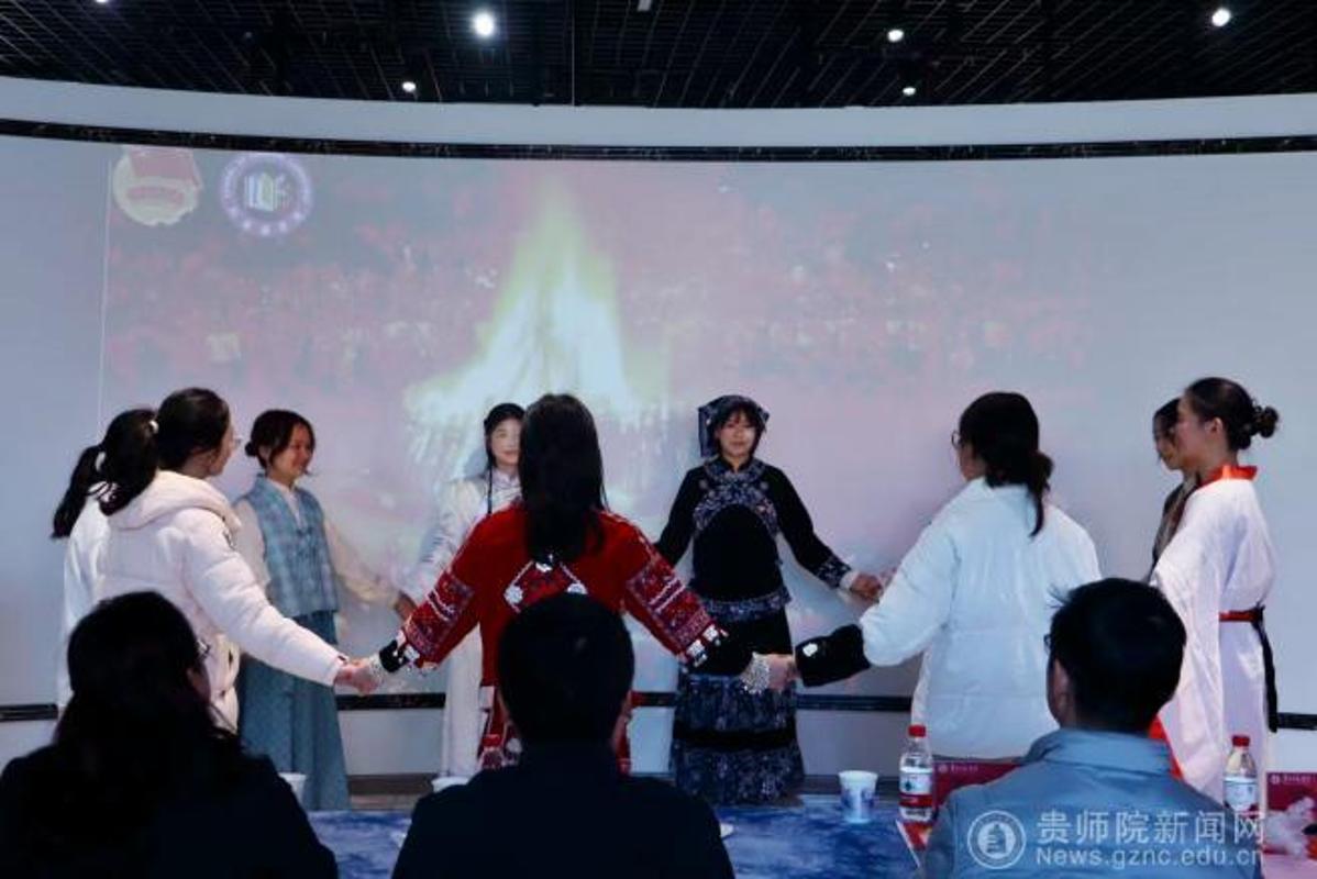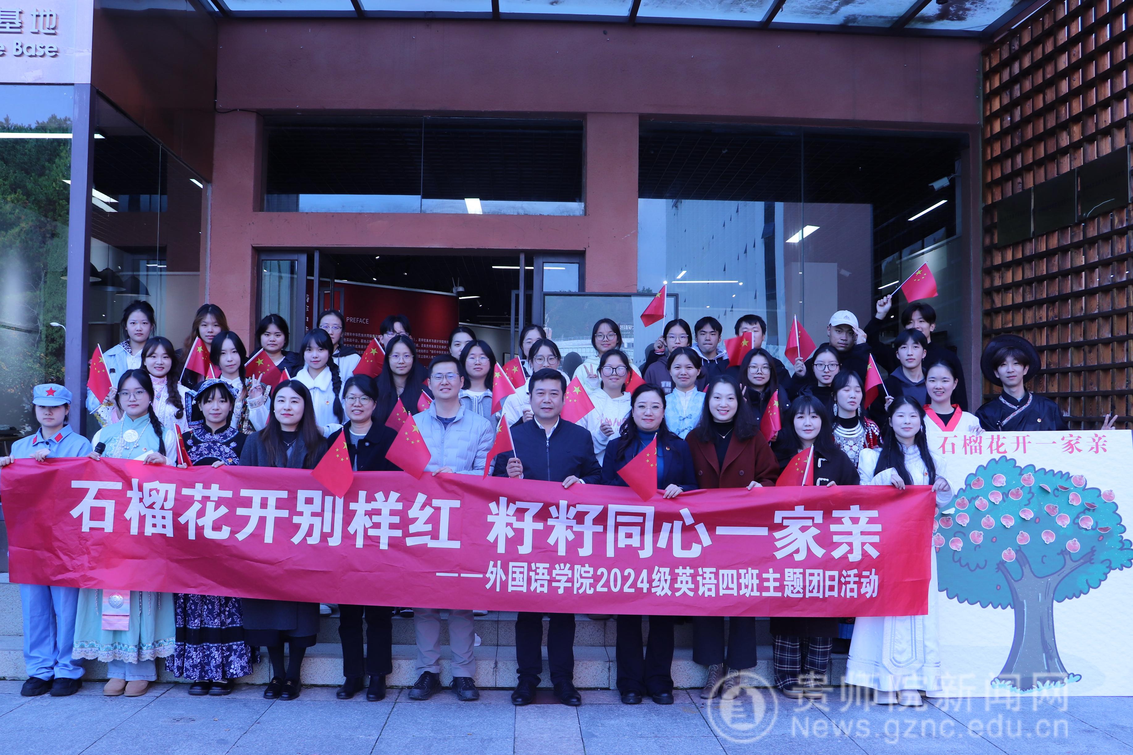 本网讯 为深入学习贯彻党的二十届四中全会精神,落实习近平总书记关于加强和改进民族工作的重要思想,近日,外国语学院2024级英语4班在美育实践基地成功举办“石榴花开一家亲”民族团结沉浸式主题团日活动。校党委常委、组织部部长、党政办公室主任孙家家,校党委委员、团委书记周煜,外国语学院党委书记严兴诚、副书记张维域、副院长罗泳、团委书记李菁菁、辅导员闫娜应邀出席,与班级全体同学共同沉浸式感受民族团结的深厚底蕴与青春力量。