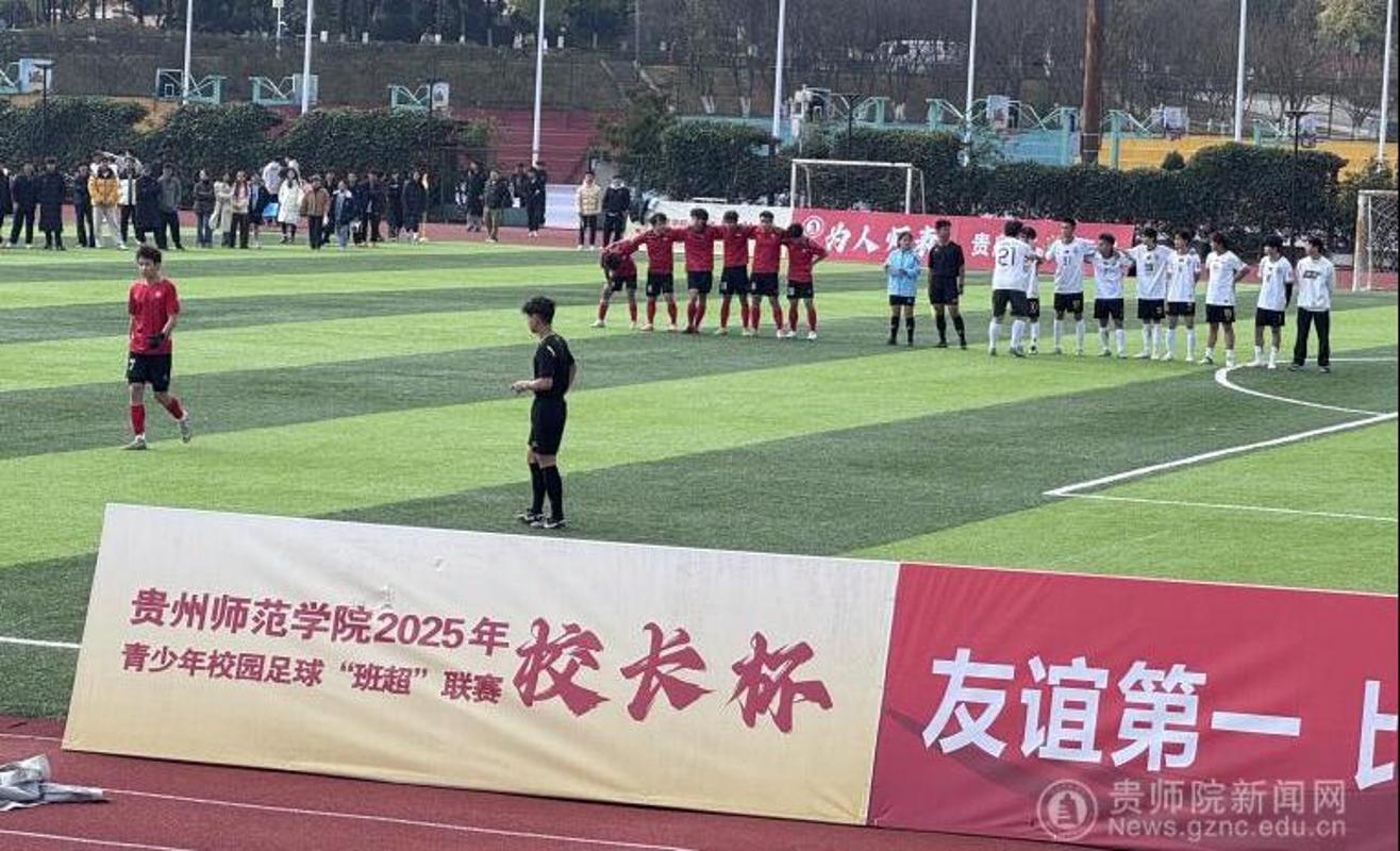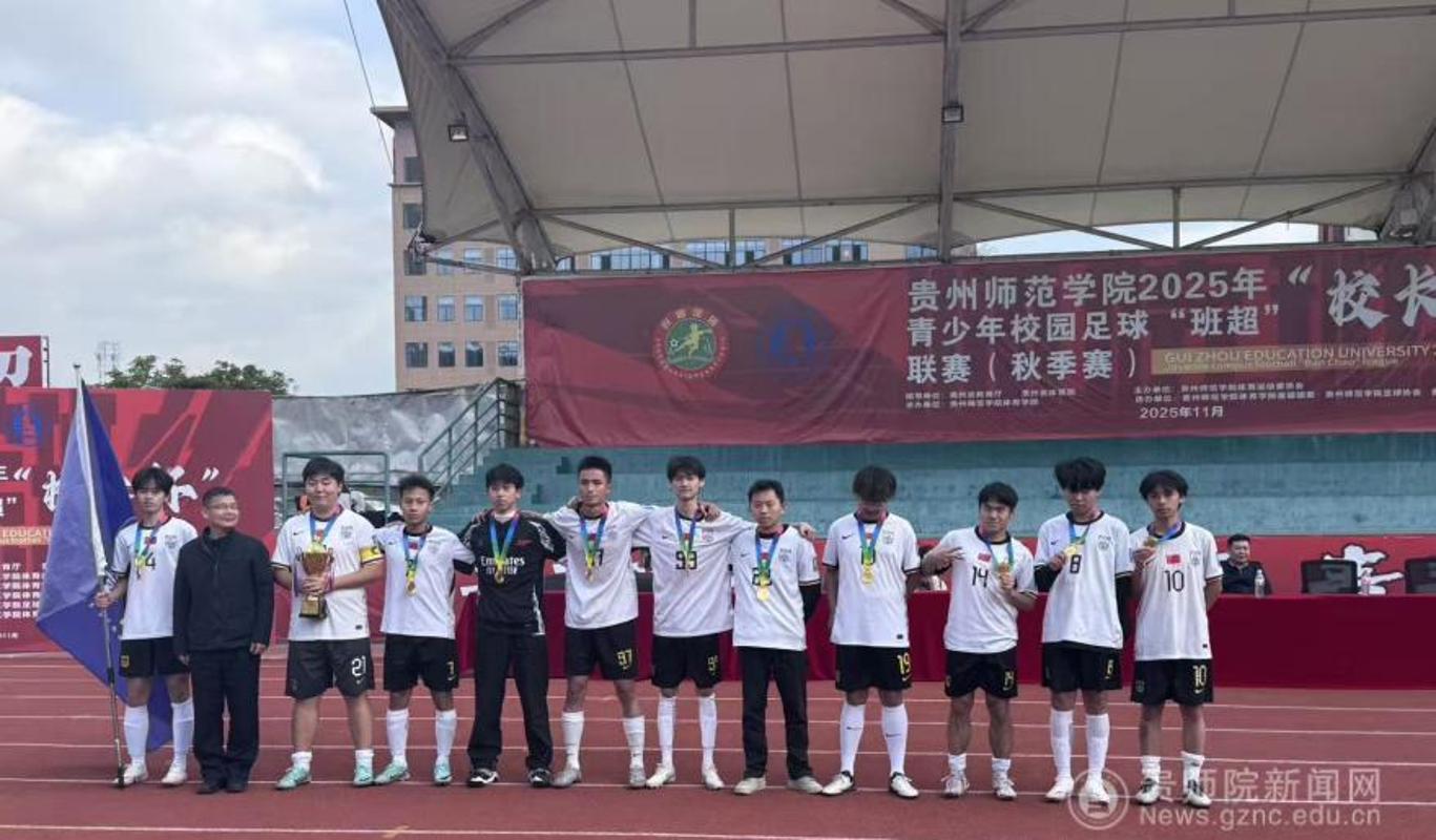 本网讯 近日,贵州师范学院2025年“校长杯”青少年足球“班超”联赛(秋季赛)圆满落幕。外国语学院24级英语四班王言辙、25级英语四班张鹏鹏与商学院学子组成联队,赛场拼搏、默契配合,一路过关斩将,摘得本次联赛桂冠。其中,我院25级英语四班张鹏鹏凭借出色的赛场表现,斩获“最佳球员”称号。