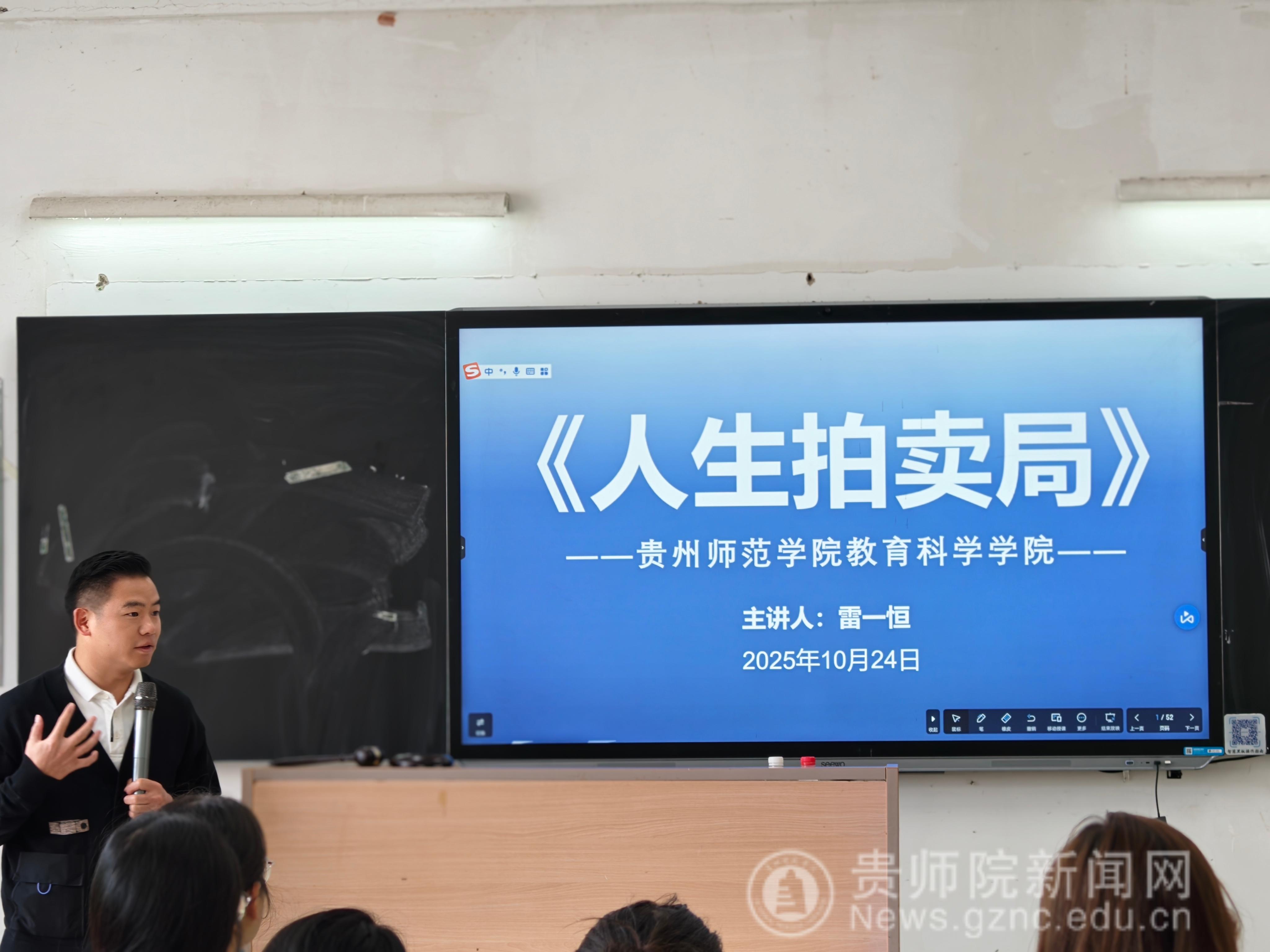 本网讯 2025年10月24日,教育科学学院团委学生会在逸夫楼204教室成功举办“人生拍卖局”互动体验活动。活动由贵州优举企业管理咨询有限公司负责人雷一恒老师主讲,旨在通过模拟人生选择与资源竞拍,引导学生深入思考价值观与决策逻辑。