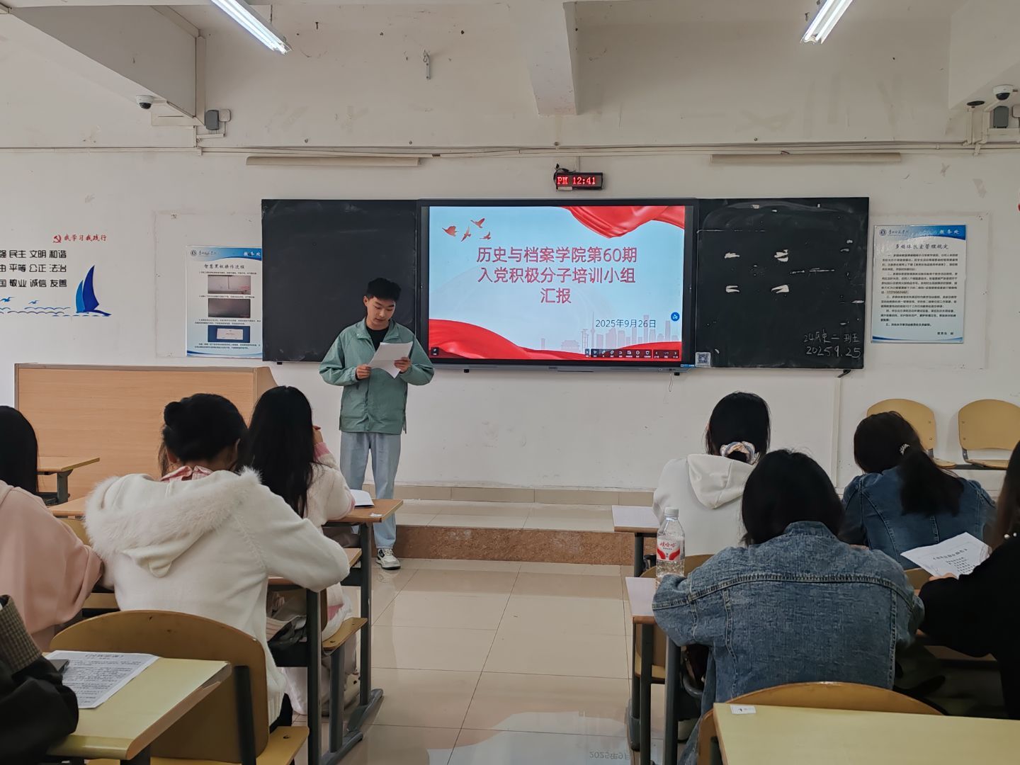 本网讯  为了巩固学院入党积极分子培训班的培训成果,加强学员之间的学习交流互动,提高全员思想政治素质,2025年9月26日,历史与档案学院第60期入党积极分子培训班全体学员,在明德楼423教室举行学习交流会。会议由党建工作中心穆婷婷同学主持。