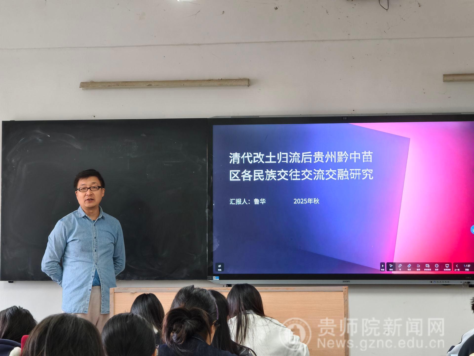 本网讯 10月22日,明辨楼407教室内气氛热烈,一场聚焦“清代改土归流后贵州黔中苗区各民族交往交流交融研究”的印山讲坛学术讲座在此开讲。本次讲座由鲁华教授主讲,历史学师生共110人参与,探寻清代民族交融印记。