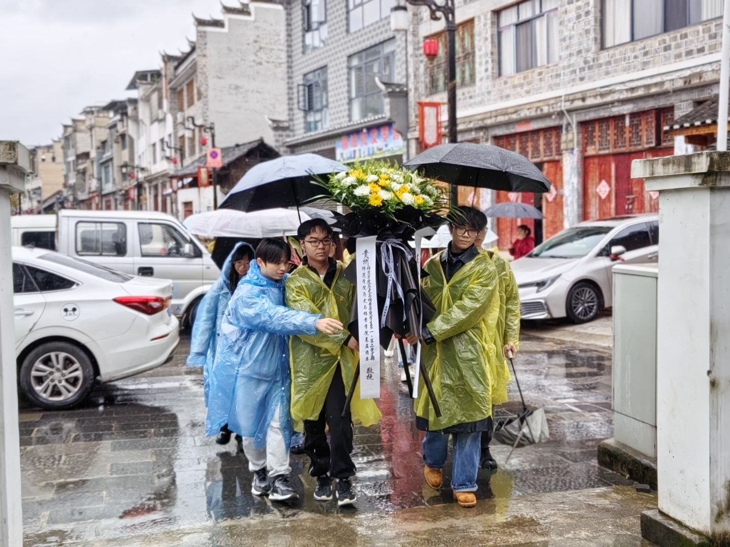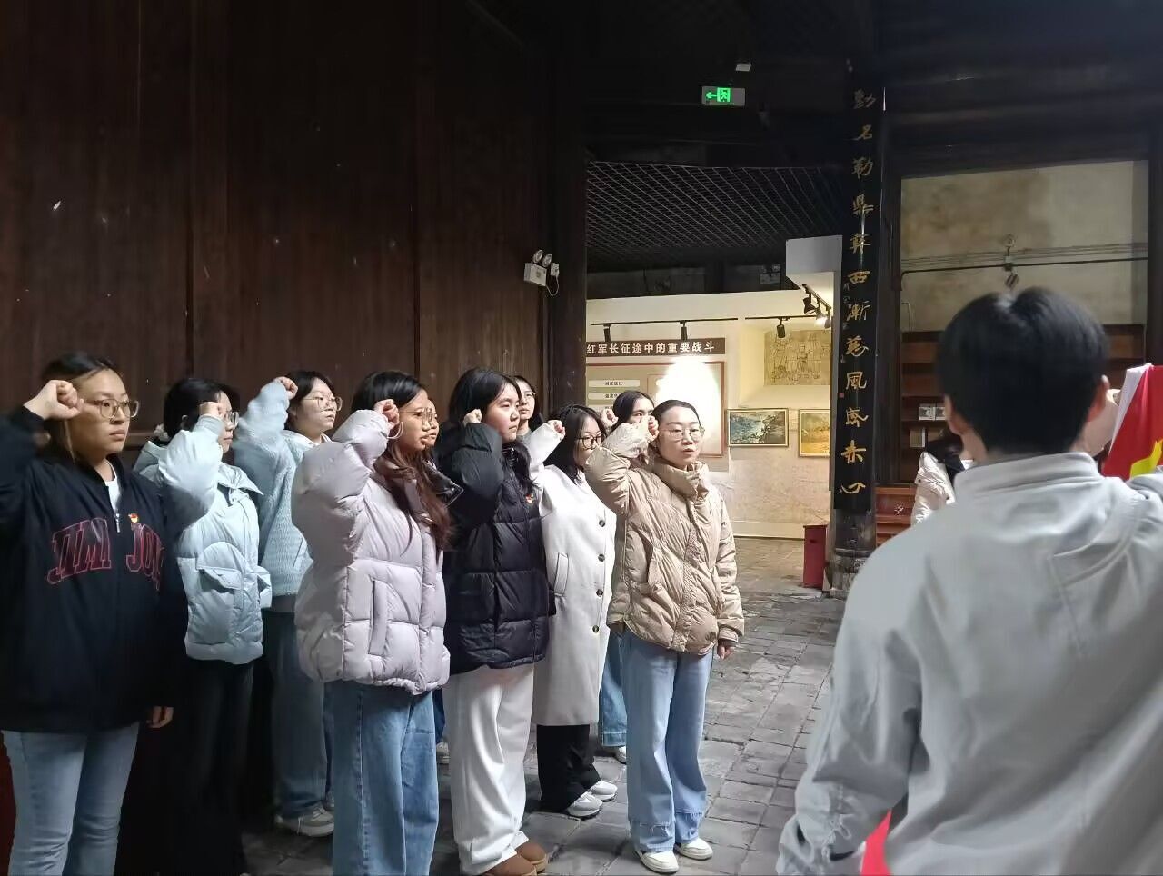 随后,大家先后参观了旧州天后宫的黄平县革命历史陈列馆与仁寿宫。在黄平县革命历史陈列馆,通过馆藏的革命文物、历史照片和文献档案,系统地了解了旧州作为“黔东重镇”的历史变迁,以及红军在此开展革命活动的重要史实。党员同志们在陈列馆中面向鲜红党旗庄严肃立,高举右拳重温入党誓词,团员青年面向团旗再次宣誓,铿锵有力的誓言在展厅内久久回荡,彰显出传承红色基因、践行初心使命的坚定信念。在参观仁寿宫时,独特的建筑风格与深厚的文化底蕴让大家眼前一亮,进一步加深了对贵州地域文化与红色历史交融发展的认识。学生表示通过参观从古建筑里读懂了文化自信,从红色故事中校准了青春航向。