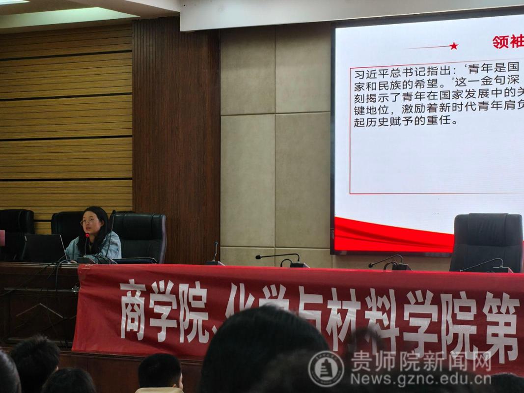本网讯 为深入学习贯彻习近平总书记关于青年工作的重要思想和习近平总书记对贵州工作的重要指示精神,贵州师范学院商学院与化学与材料学院于10月21日在道德讲堂开展第三十二期业余团校专题二培训“学思践悟新思想,争做时代新青年”。化学与材料学院团委副书记邵琳担任此次培训主讲人,两学院第三十二期业余团校全体学员共同参加。