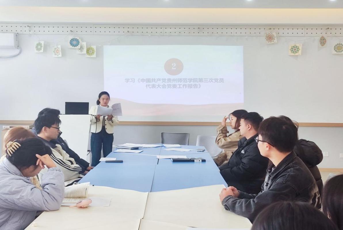 活动伊始,梁敏带领全体党员学习了习近平总书记在全球妇女峰会上的主旨讲话精神,深刻理解了全球妇女事业发展的重要意义以及中国在推动妇女事业发展方面的担当。随后,梁敏详细解读了《中国共产党贵州师范学院第三次党员代表大会党委工作报告》。报告明确了学校未来五年的发展目标和行动计划,强调了高质量发展和特色建设的重要性。报告提出的“实施九大行动”和“六大工程”为学校的全面发展提供了具体路径,体现了学校对教育质量、科研创新和人才培养的重视。报告的“三步走”战略,为学校长远发展描绘了蓝图,展现了学校在新时代背景下的使命感和责任感。