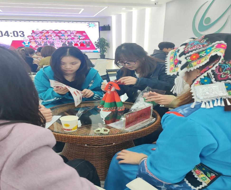 活动以“疆域寻亲”拼图赛拉开序幕,六个小组手持56个民族特色贴纸,精准地将其对应到中国疆域图的民族分布区域,在分工协作中筑牢“中华民族一家亲”的地理认知根基。随后,“声声不息”歌曲接龙赛点燃激情,8秒接唱的紧张挑战令人心潮澎湃,在歌声中传递民族情谊。“华彩匠心”服饰DIY工坊尽显创意,各小组发挥巧思,利用材料包还原民族服饰经典纹样与配饰,同步完成民族文化主题问题卡作答,打造特色民族服饰,并介绍其文化底蕴。活动在“舞动同心”歌舞联欢中推向高潮,全体师生手拉手围成圆圈,跟随《丽江三部曲》的欢快旋律共跳纳西族传统打跳,用舞步诠释民族团结的深厚情谊。