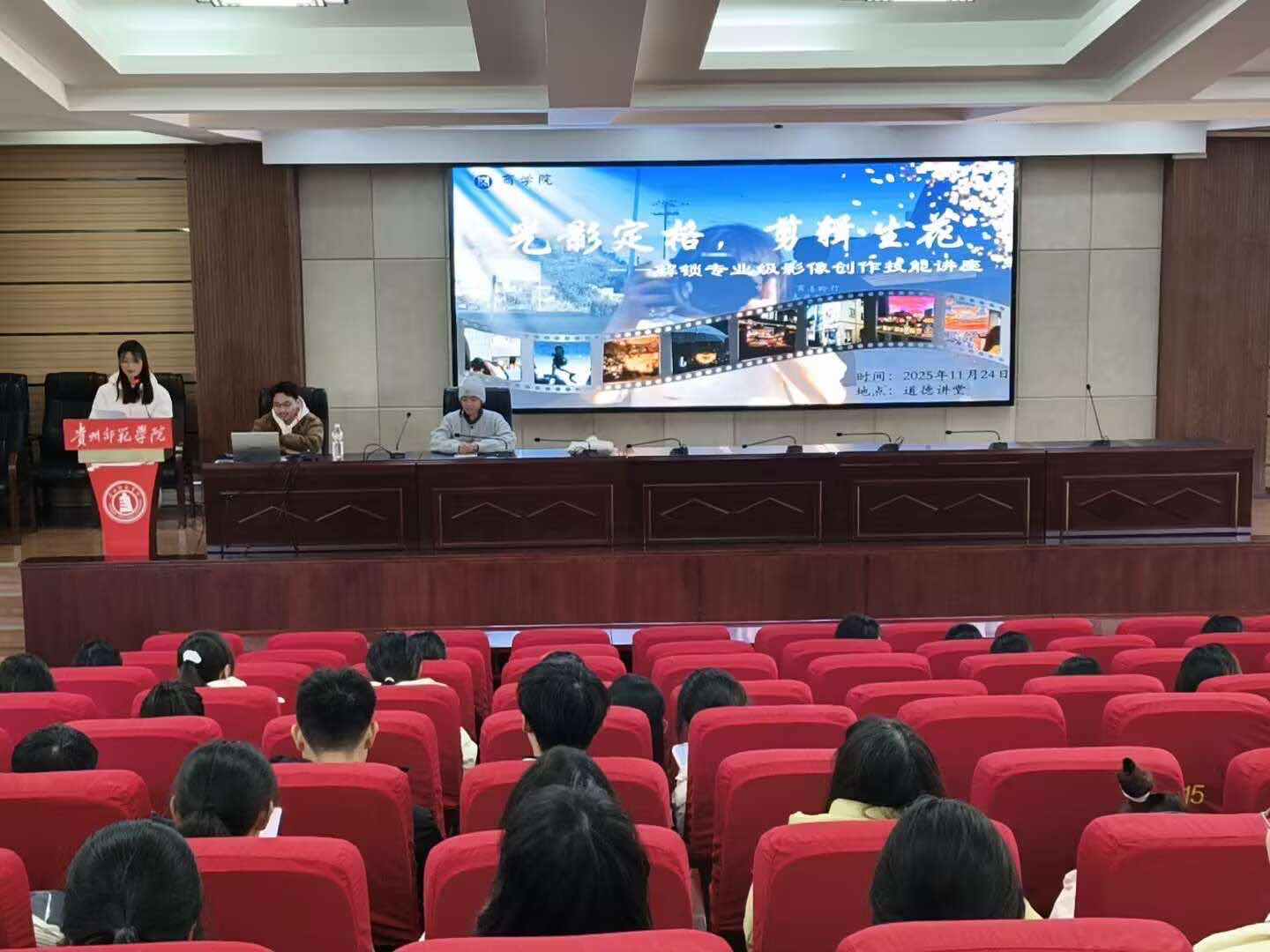 本网讯 为帮助同学们扎实掌握影像创作核心技能,提升视觉表达与艺术审美素养。11月24日,商学院团委学生会于道德讲堂顺利举办“光影定格,剪辑生花”专业影像创作技能专题讲座。本次活动由张思宇同学主持,特邀校内朝花夕拾工作室核心成员龙玉平、陈才厚两位同学担任主讲人,来自各学院的150名同学及综合事务部全体成员齐聚一堂,共同探寻光影艺术的独特魅力。