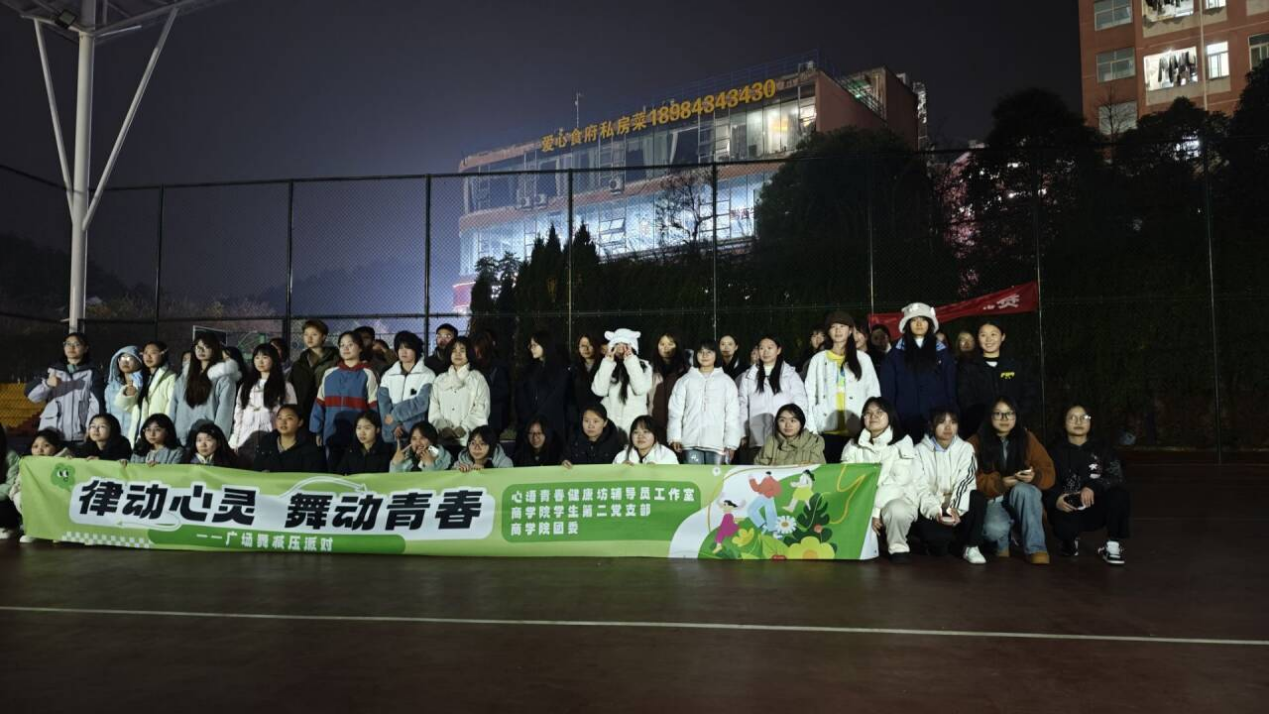 本网讯 为帮助同学们释放和舒缓心理压力、愉悦身心,心语青春健康坊辅导员工作室联合商学院学生第二党支部、商学院团委近期举办了以“律动心灵,舞动青春”为主题的广场舞减压派对,为期三周的活动圆满落下帷幕。