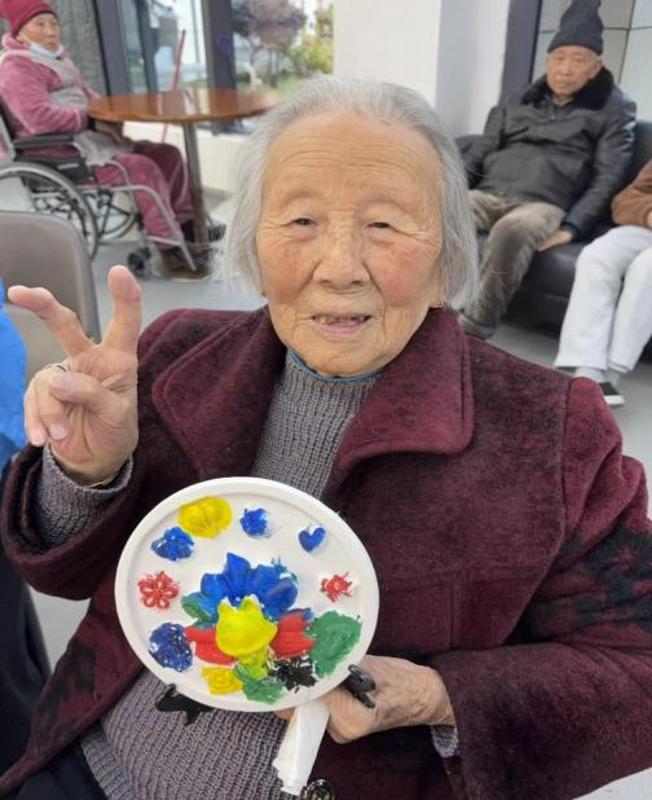 活动中,志愿者带着老人们学习了“手部八段锦”活动手指,疏通经络为接下来的石膏画活动的进行做准备。随后志愿者们布置好活动区域,备齐石膏娃娃、丙烯颜料及各色画笔。他们俯身于老人身旁,一对一耐心协助老人们完成石膏画。素白的石膏胚在指尖与画笔的触碰间,逐渐焕发出生动模样。创作过程中,养老院内笑语盈盈。老人们一边涂色,一边向身旁的年轻人讲述往昔岁月。志愿者们认真倾听,轻声回应,时光在色彩的流动与故事的叙述中静静交汇。看着自己亲手完成的彩绘作品,老人们脸上绽放出满足的笑容,不住地欣赏着自己亲手创作的“独家艺术品”。