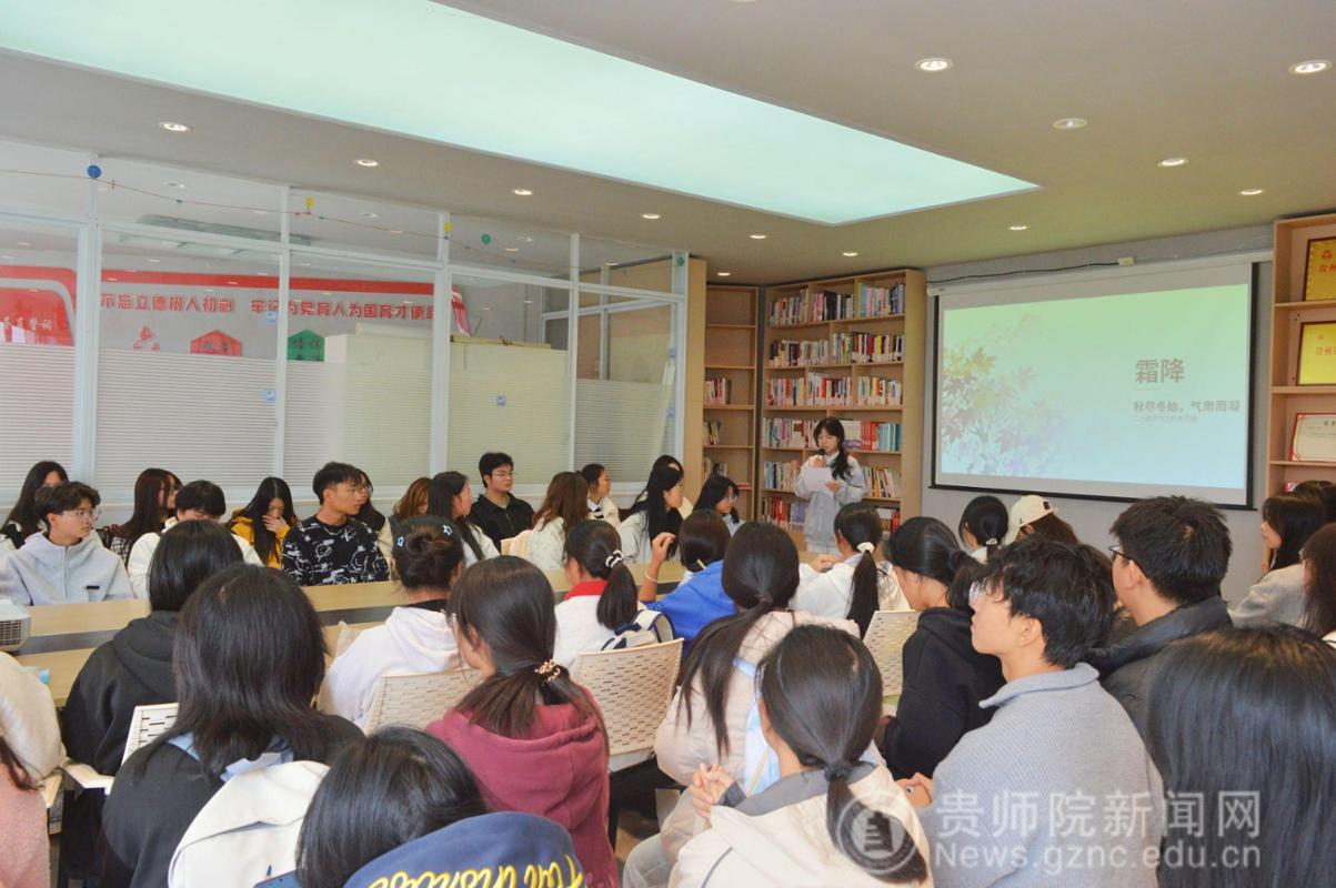 活动伊始,主持人对本次活动致欢迎辞并介绍流程。随后,工作室老师路曦越从专业角度出发,系统解读了霜降节气在古典诗词中的意象表达与阅读在情感陶冶方面的重要价值,为整场活动奠定了文化基调。