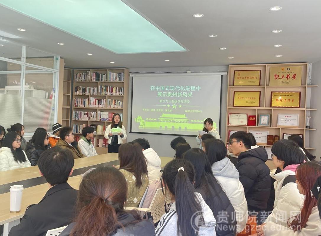 本网讯 为深入学习贯彻党的创新理论,引导青年学生深刻把握中国式现代化的丰富内涵,11月26日,数学与大数据学院团委联合丽琼工作室开展“在中国式现代化进程中展示贵州新风采”理论宣讲活动,本次活动由学院团委负责老师谭瑾和团委副书记郭俣彤主讲,学院各团支部书记及团干参与活动。