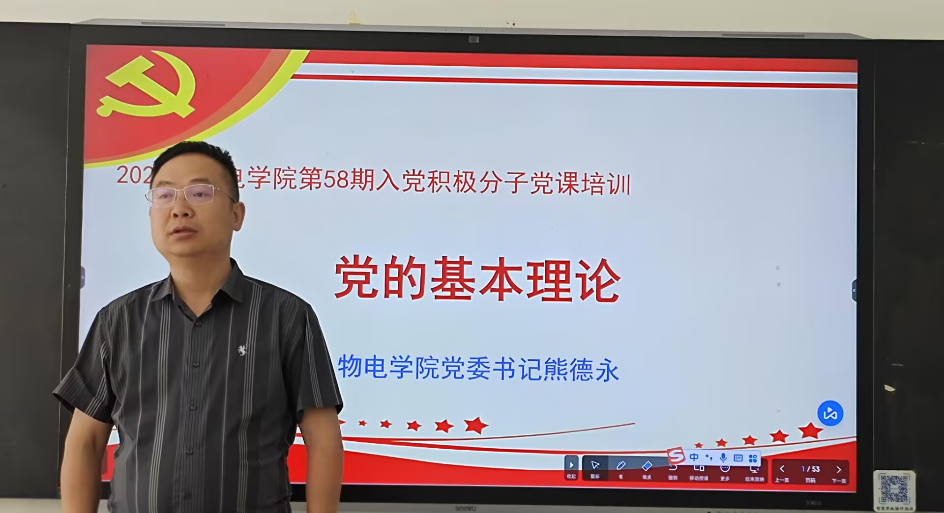 本网讯 为使学院入党积极分子深入学习党的基本理论,深刻理解党的性质、宗旨、指导思想和奋斗目标,进一步坚定理想信念,增强党性修养,为早日成为一名合格的共产党员奠定基础。2025年9月23日,物理与电子科学学院第60期入党积极分子培训班第二次党课在宁静楼427开讲。本次党课由学院党委书记熊德永主讲,党课主题为“《党的基本理论》及《宗教事务条例》”,学院第60期全体入党积极分子学员参加培训。