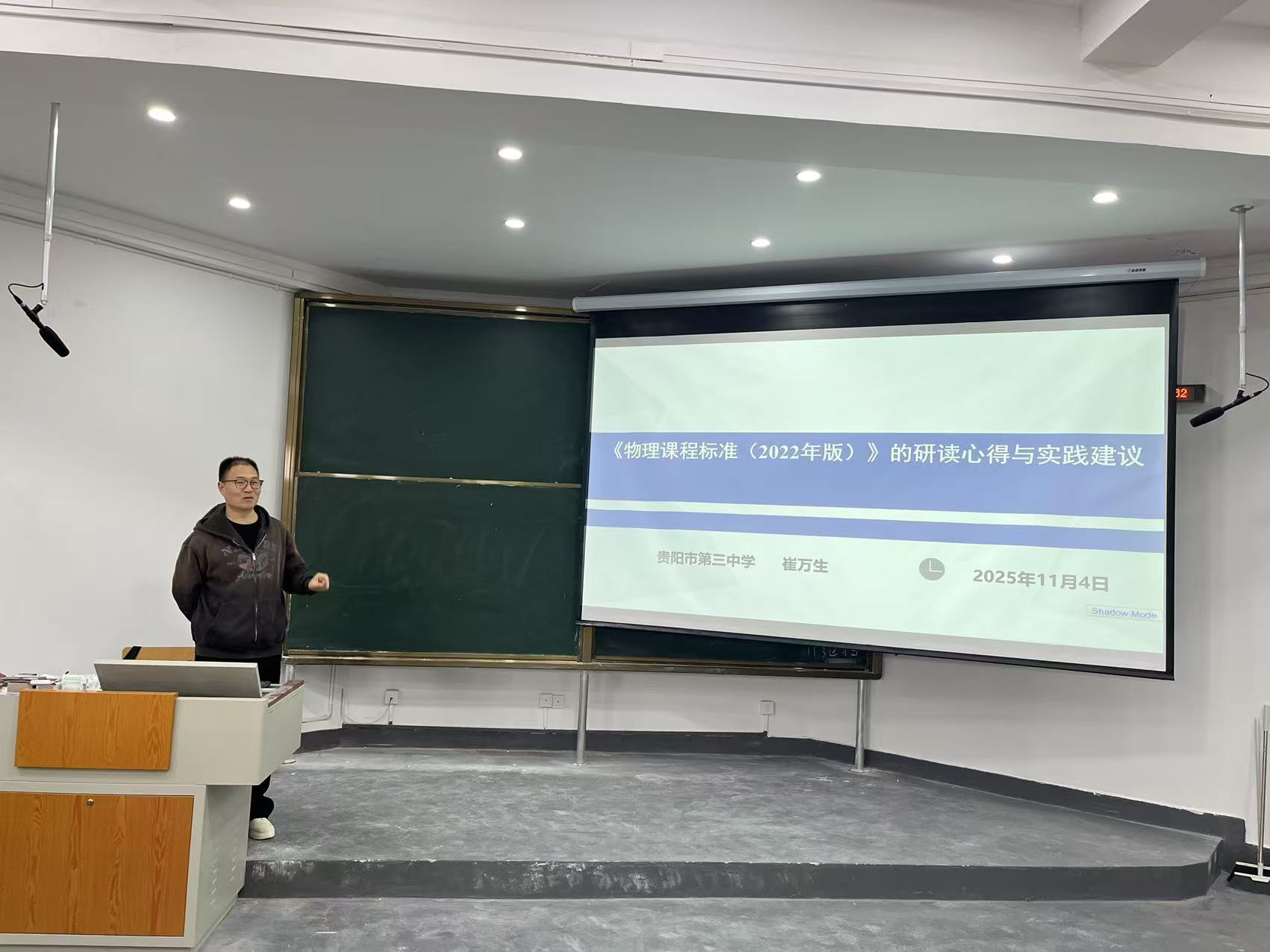 为帮助物理学师范专业学生精准把握课程标准核心要素,提升教学实践能力,2025年11月4日上午,物电学院在宁静楼436开展以“《物理课程标准》的研读心得与实践建议”为主题的专题讲座,学院特邀教师贵阳市第三中学崔万生老师主讲,2023级物理学专业师范生全体参与此次活动,本次活动由物电学院岳天天老师主持。
