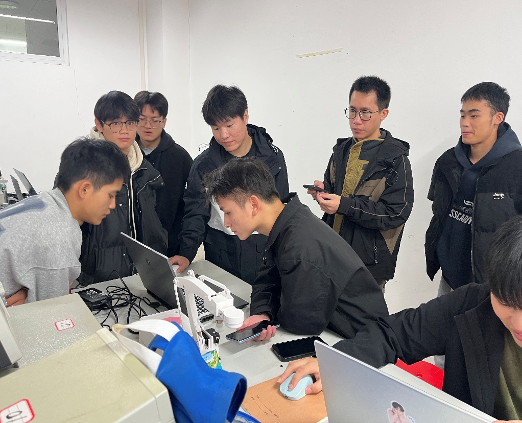 实践课程以“技术闭环”为设计主线,系统推进教学实施。指导老师首先深入讲解了AI机械臂的运动学原理与编程控制逻辑,为学生奠定坚实的理论基础;随后,指导老师聚焦实战环节,指导学生分组构建适用于不同任务的专属数据集——在垃圾分类任务中,学生需标注塑料、纸张、金属等多种垃圾的图像特征,持续优化模型识别准确率;在简易计算任务中,则训练机械臂通过视觉识别数字卡片排列,完成基本加减运算并准确输出结果。在格致楼202教室内,理论教学、数据处理与机械臂调试同步开展,各小组通过反复优化数据集结构与调整模型参数,逐步实现了机械臂从“感知识别”到“精准执行”的全流程功能。