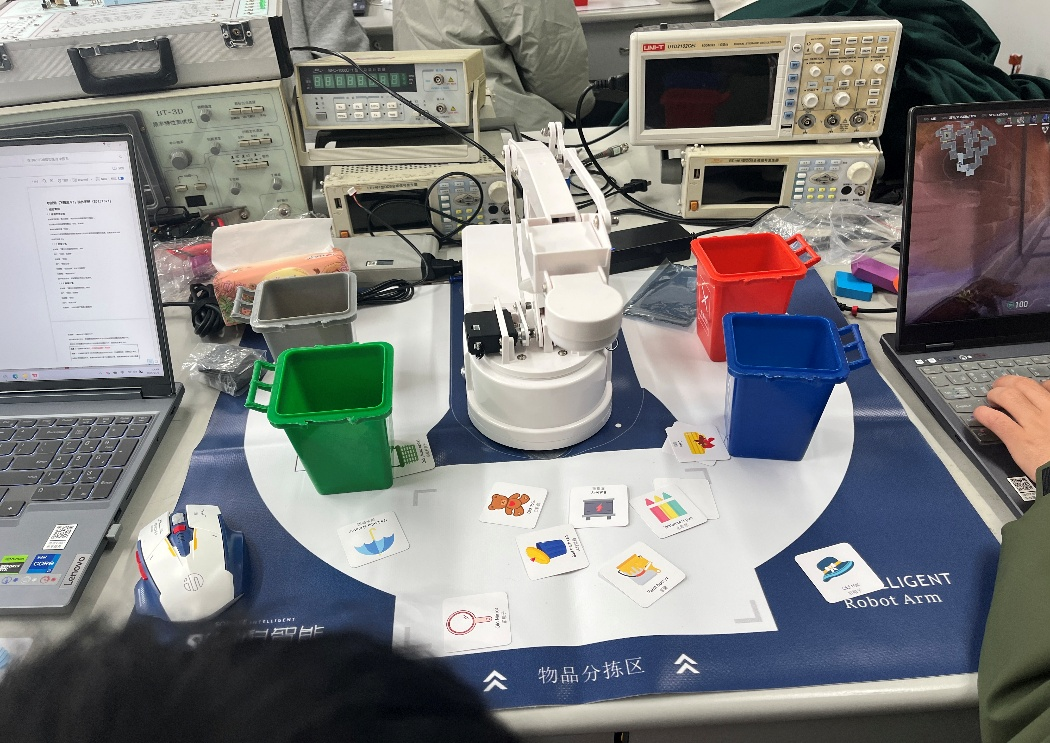 在基于飞腾CPU与国产FPGA的软硬件平台上,学生们从零搭建数据集框架,不断克服“识别误差”“控制延迟”等技术难点,最终实现了机械臂对垃圾的准确分拣与计算过程的可视化输出。这一过程不仅有效提升了学生的编程调试与数据处理能力,也使其切身感受到AI技术与机械执行系统融合所带来的实际价值。