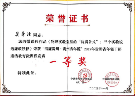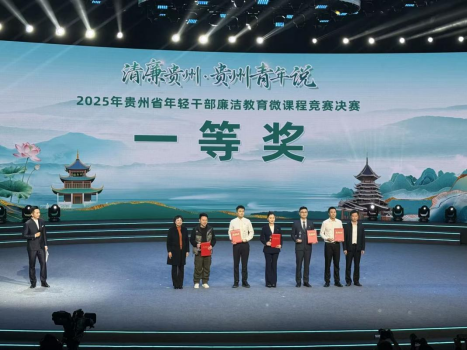 本网讯 11月18日,由中共贵州省纪委机关、共青团贵州省委联合主办的2025年贵州省年轻干部廉洁教育微课程竞赛决赛在贵州广播电视台演播厅圆满落幕。我院教师莫章洁讲授的廉洁教育微课程作品《物理实验室里的“防腐公式”:三个实验说透廉政铁律》,在21个参赛作品中脱颖而出,荣获一等奖。