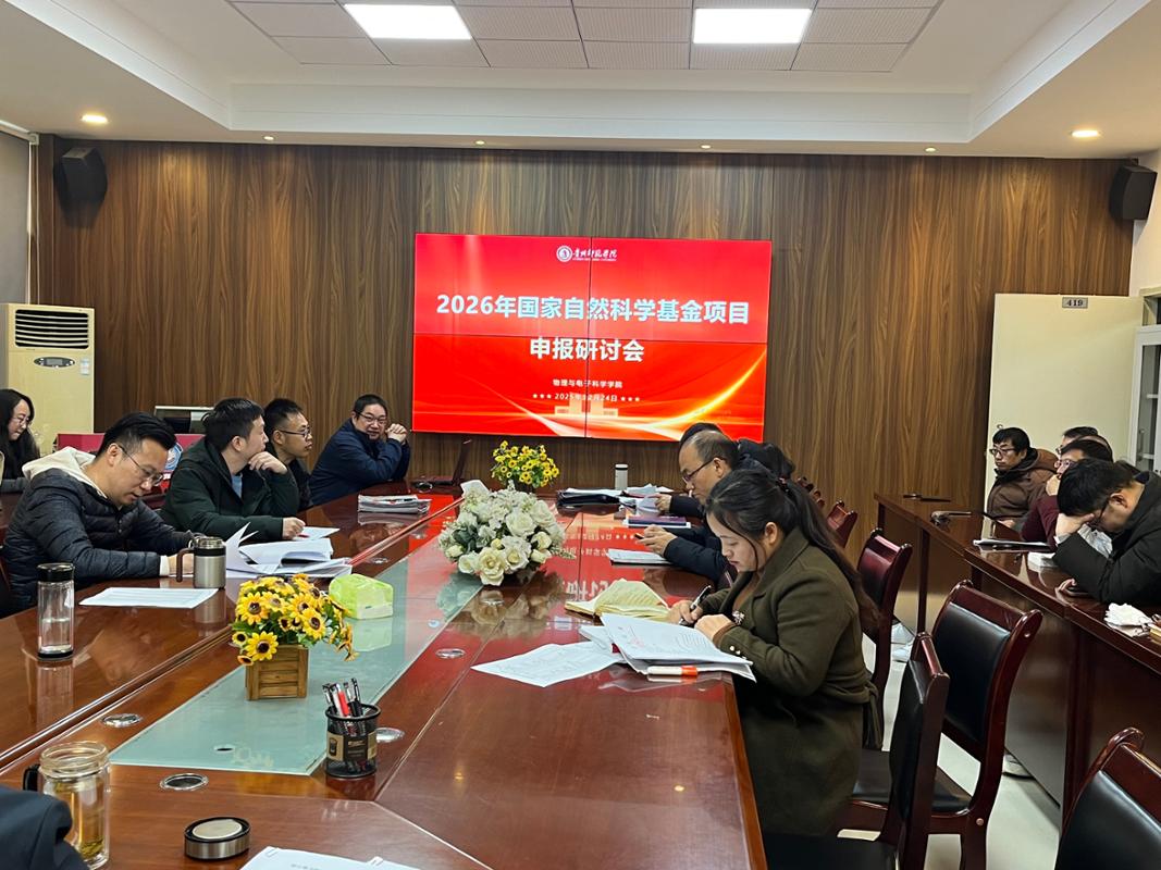 本网讯 12月24日上午,物电学院在学术活动周期间召开2026年国家自然科学基金项目申报专题研讨会。会议在宁静楼439会议室举行,由余宏老师主持,学院13位拟申报2026年国家自然科学基金项目的教师全员参会,为新一轮基金申报工作筑牢基础。