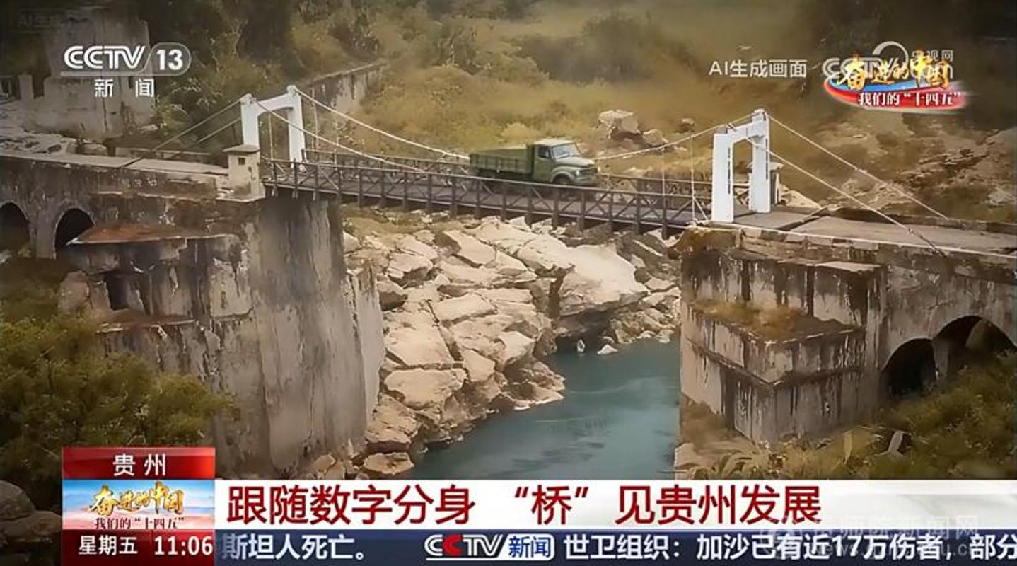 在10月3 日11点, CCTV13《新闻直播间》播出的《奋进的中国——“我们的十四五”》栏目中的贵州“万桥飞架”天堑变通途,是团队再次尝试 “全 AI 叙事结合实时直播报道” 的历史人文作品。视频以花江峡谷大桥为地理坐标,从 “桥” 的视角切入,用 AI 技术复原了不同历史时期贵州的 “跨江记忆”: