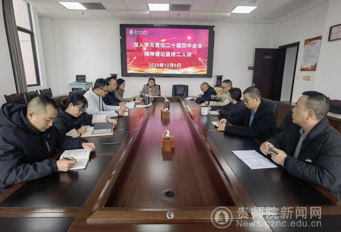 为深入学习贯彻党的二十届四中全会精神,12月9日下午,继续教育学院召开“深入学习贯彻党的二十届四中全会精神理论宣传二人讲”主题党日活动。活动由学院直属党支部书记韦丹主持,全体党员参加了会议。