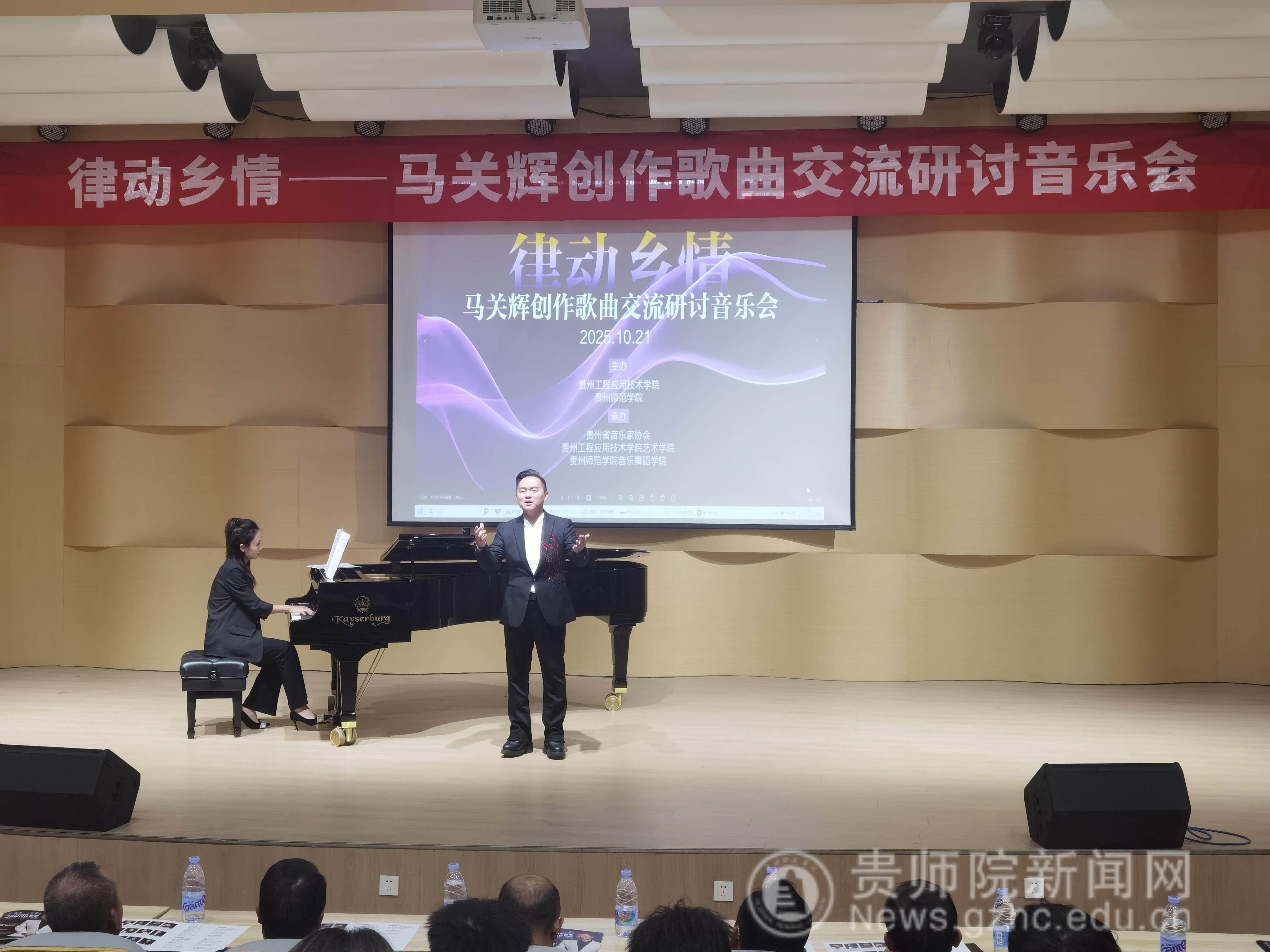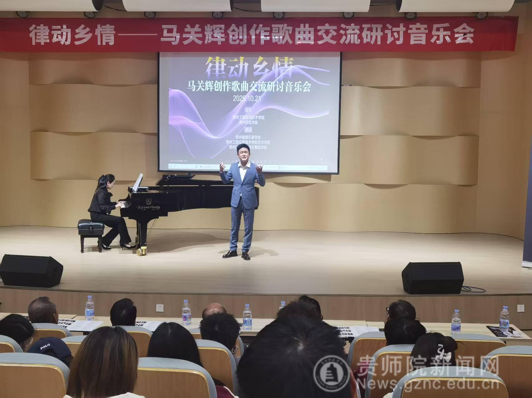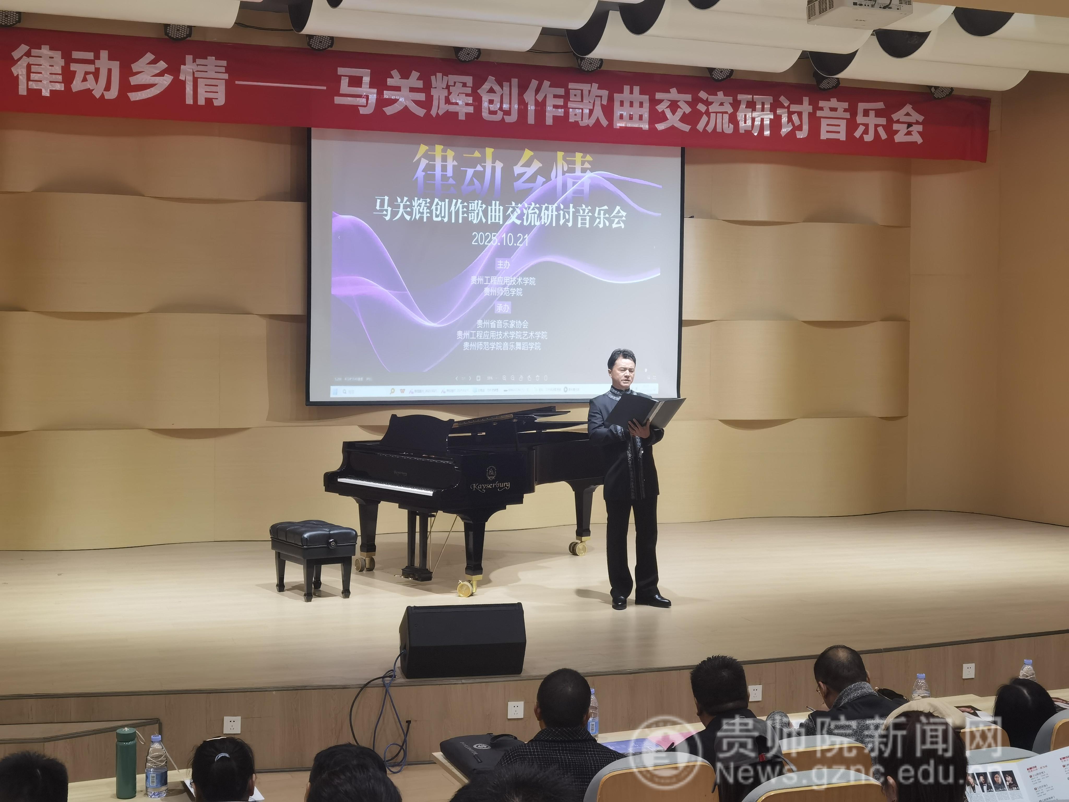 本网讯 2025年10月21日下午,由贵州工程应用技术学院、贵州师范学院联合主办,贵州省音乐家协会、贵州工程应用技术学院艺术学院、贵州师范学院音乐舞蹈学院承办的“律动乡情——马关辉创作歌曲交流研讨音乐会”在贵州工程应用技术学院艺术学院音乐厅举行,来自毕节音乐界专家学者、贵州工程应用技术学院师生等200余人参加。