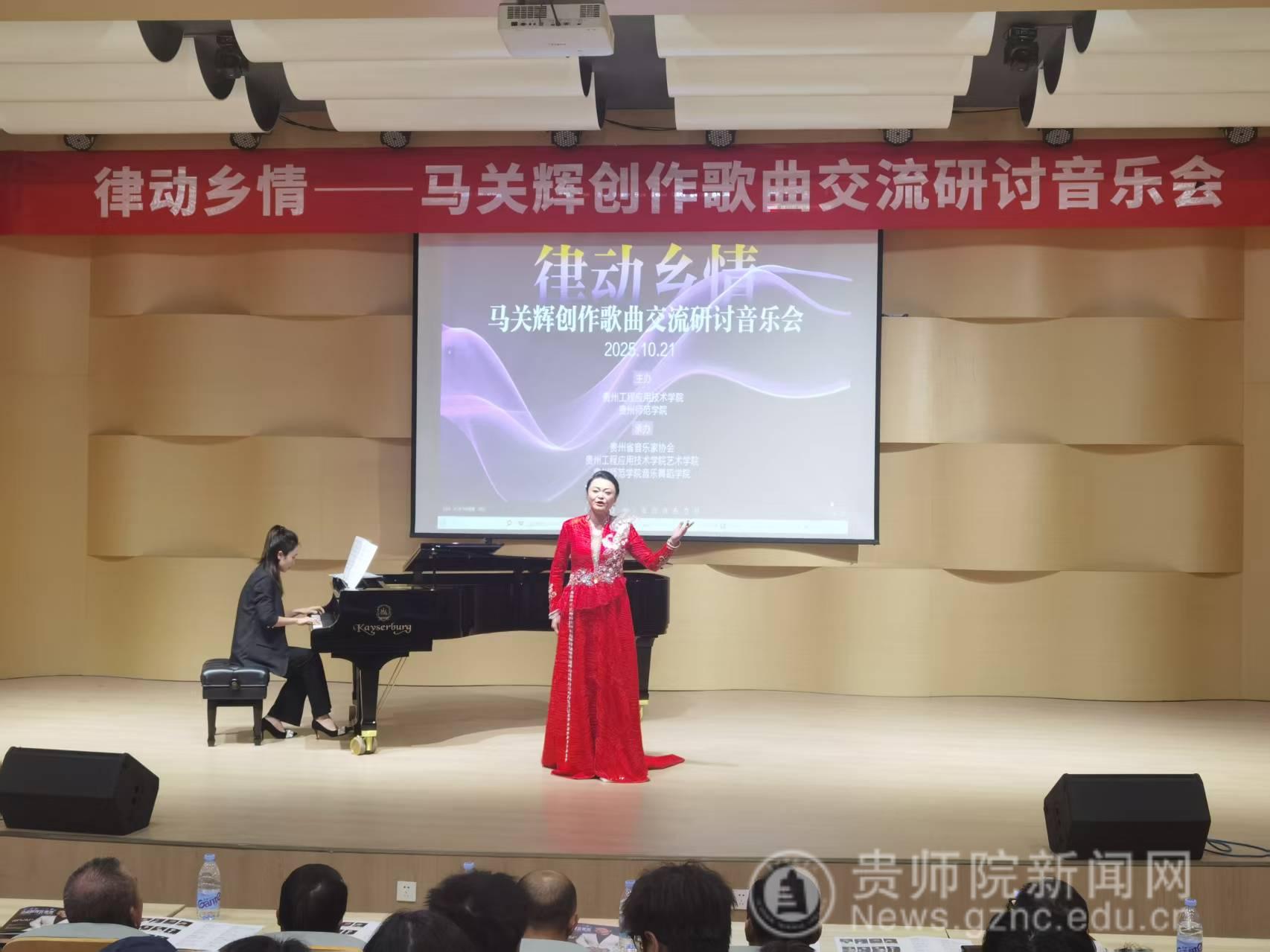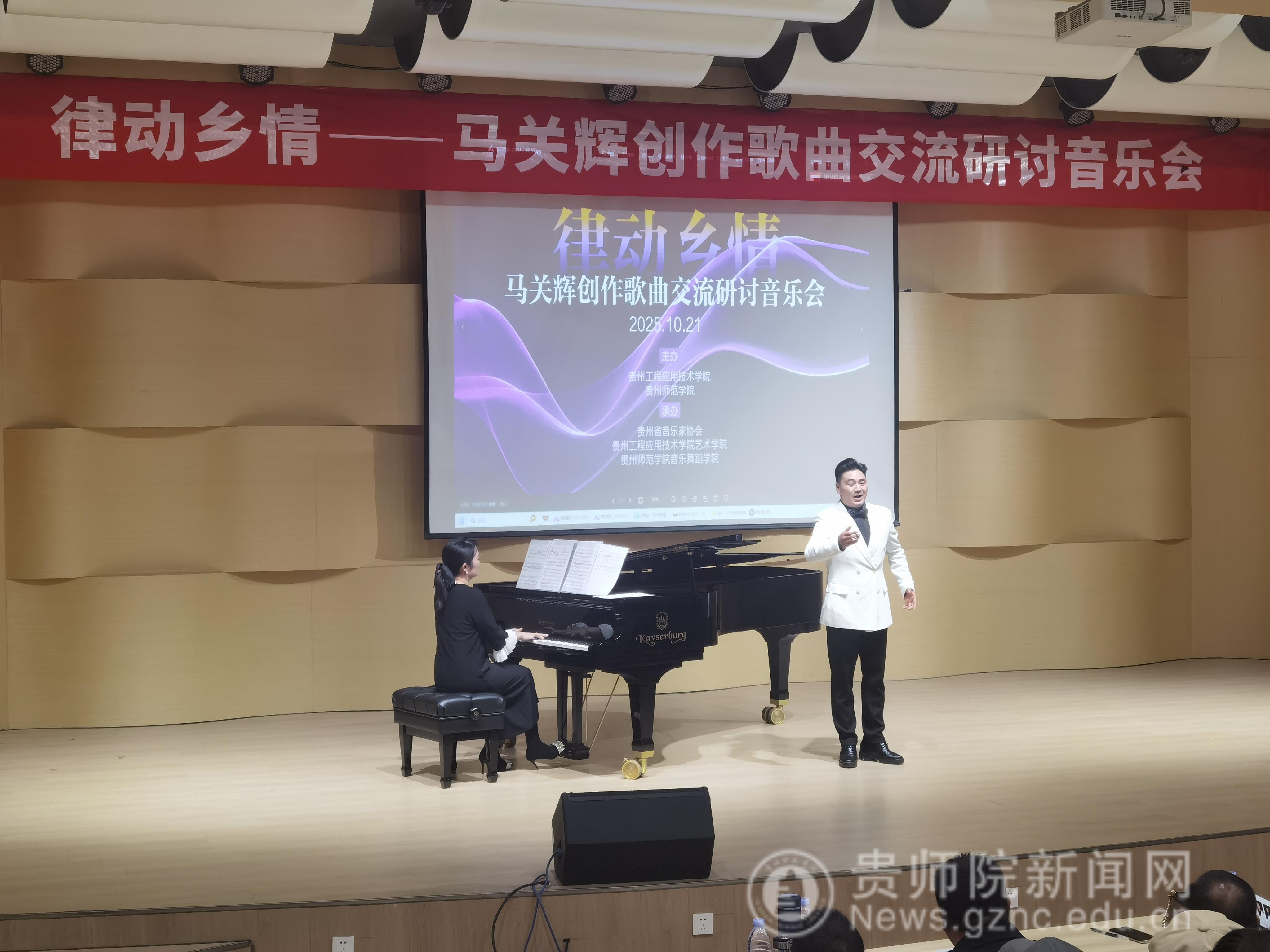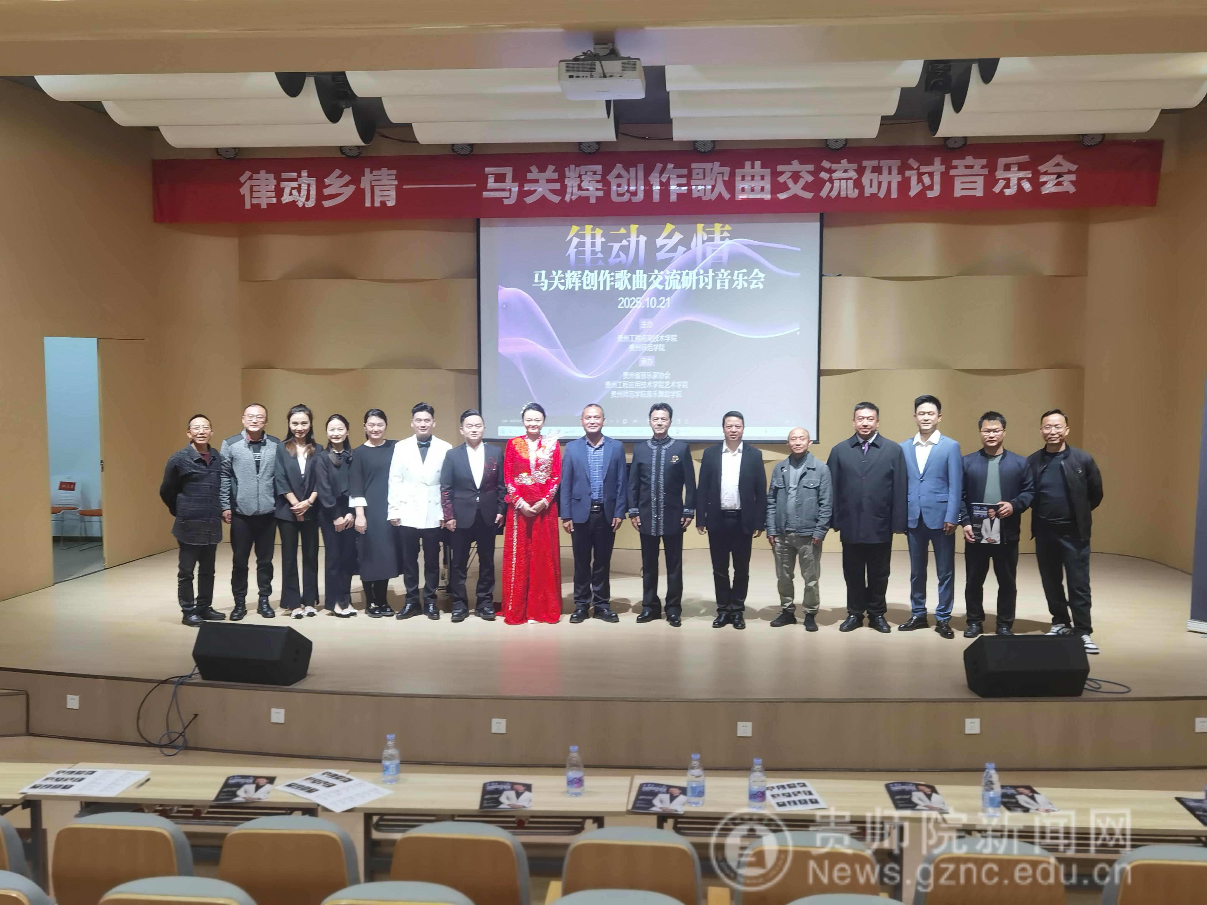 本网讯 2025年10月21日下午,由贵州工程应用技术学院、贵州师范学院联合主办,贵州省音乐家协会、贵州工程应用技术学院艺术学院、贵州师范学院音乐舞蹈学院承办的“律动乡情——马关辉创作歌曲交流研讨音乐会”在贵州工程应用技术学院艺术学院音乐厅举行,来自毕节音乐界专家学者、贵州工程应用技术学院师生等200余人参加。