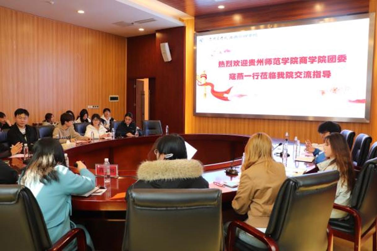 本网讯 团学工作是高校思想政治教育的重要载体,也是凝聚青年、服务青年的关键纽带。为打破校际团学工作发展壁垒,探索新时代团学工作创新路径,贵州师范学院商学院团委书记寇燕、学院团委学生会干部代表于12月1日赴贵州商学院工商管理学院,共同召开团学工作交流座谈会。本次会议在静心湖会议中心第一会议室举行,由贵州商学院工商管理学院团总支书记肖立容主持,该学院党委副书记赵翔及两院团学指导老师、学生干部代表参会。